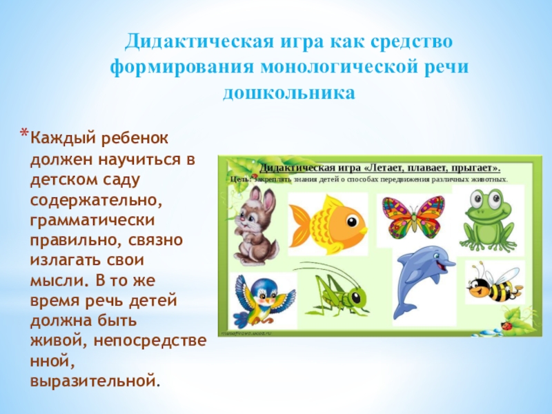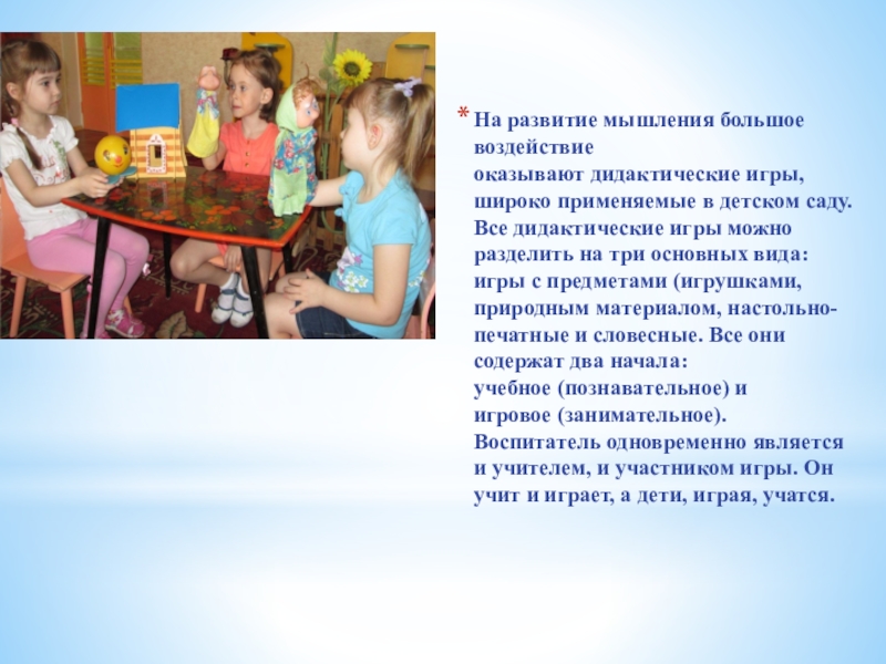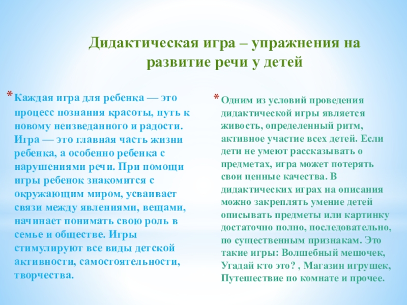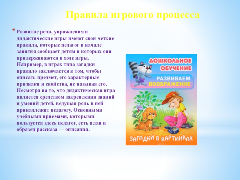 Одним из условий проведения дидактической игры является живость, определенный ритм, активное участие всех детей. Если дети не умеют рассказывать о предметах, игра может потерять свои ценные качества. В дидактических играх на описания можно закреплять умение детей описывать предметы или картинку достаточно полно, последовательно, по существенным признакам. Это такие игры: Волшебный мешочек, Угадай кто это? , Магазин игрушек, Путешествие по комнате и прочее.