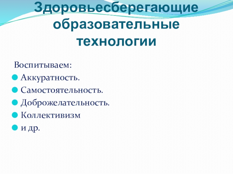 Здоровьесберегающие образовательные технологии Воспитываем:Аккуратность.Самостоятельность.Доброжелательность.Коллективизми др.