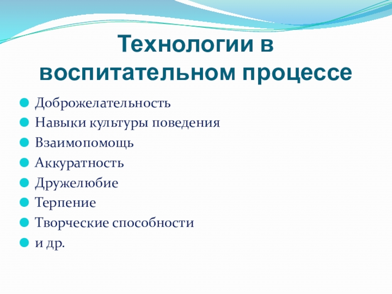 Технологии в воспитательном процессеДоброжелательностьНавыки культуры поведенияВзаимопомощьАккуратностьДружелюбиеТерпениеТворческие способностии др.