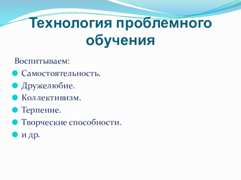 Технология проблемного обучения Воспитываем:Самостоятельность.Дружелюбие.Коллективизм.Терпение.Творческие способности.и др.