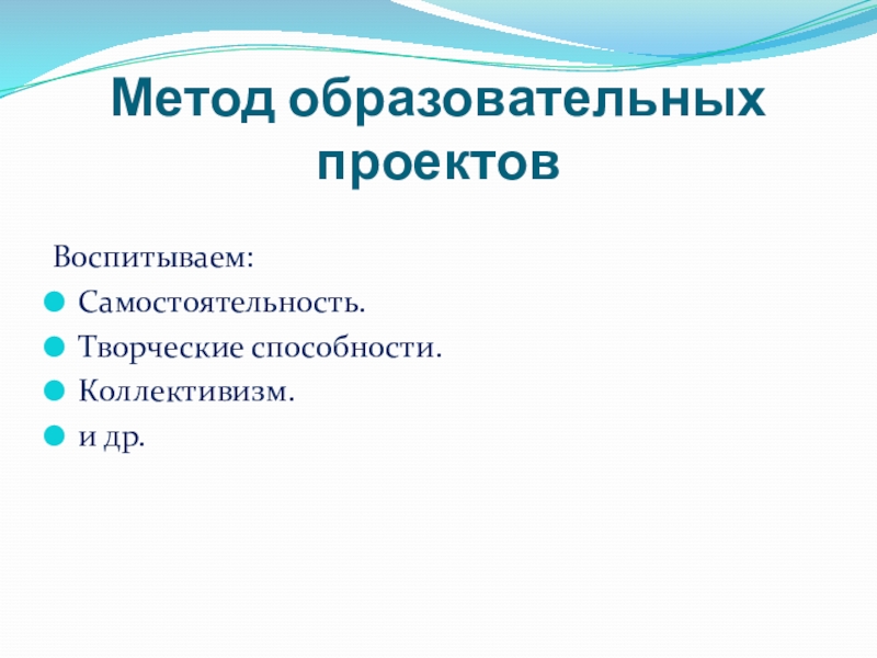 Метод образовательных проектовВоспитываем:Самостоятельность.Творческие способности.Коллективизм.и др.