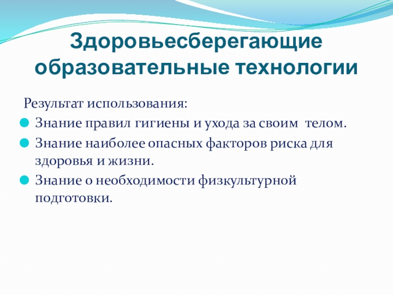 Здоровьесберегающие образовательные технологии Результат использования:Знание правил гигиены и ухода за своим телом.Знание наиболее опасных факторов риска для