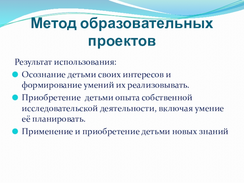 Метод образовательных проектовРезультат использования:Осознание детьми своих интересов и формирование умений их реализовывать.Приобретение детьми опыта собственной исследовательской деятельности,