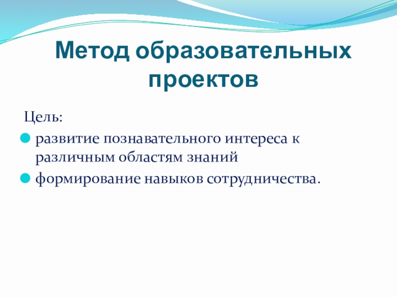 Метод образовательных проектовЦель:развитие познавательного интереса к различным областям знаний формирование навыков сотрудничества.