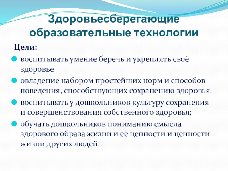 Здоровьесберегающие образовательные технологии Цели: воспитывать умение беречь и укреплять своё здоровьеовладение набором простейших норм и способов поведения,