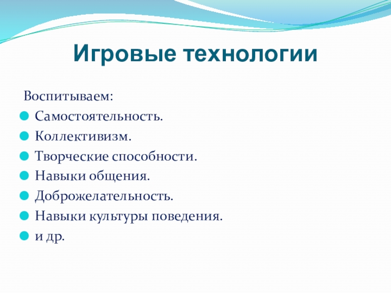Игровые технологииВоспитываем:Самостоятельность.Коллективизм.Творческие способности.Навыки общения.Доброжелательность.Навыки культуры поведения.и др.