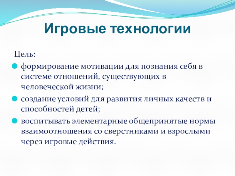 Игровые технологииЦель:формирование мотивации для познания себя в системе отношений, существующих в человеческой жизни; создание условий для развития