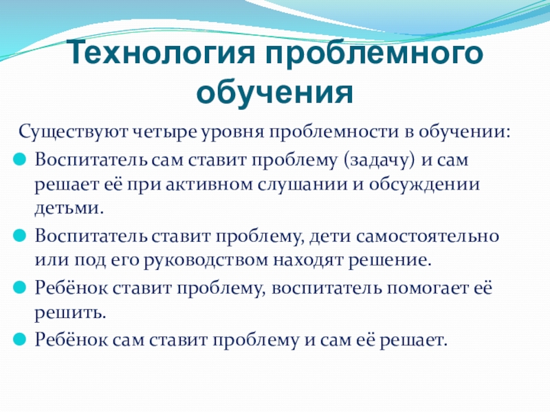 Технология проблемного обучения Существуют четыре уровня проблемности в обучении:Воспитатель сам ставит проблему (задачу) и сам решает её