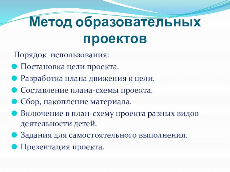 Метод образовательных проектовПорядок использования:Постановка цели проекта.Разработка плана движения к цели.Составление плана-схемы проекта.Сбор, накопление материала.Включение в план-схему проекта