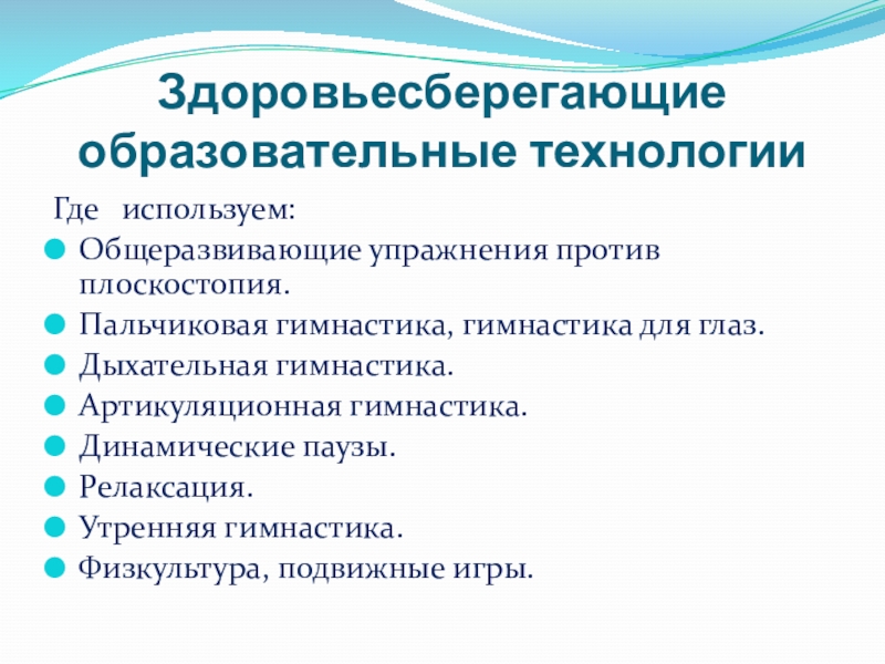 Слайд 7Здоровьесберегающие образовательные технологии