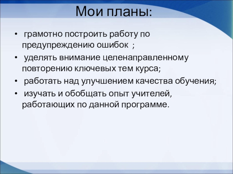 Мои планы: грамотно построить работу по предупреждению ошибок ; уделять внимание целенаправленному повторению ключевых тем курса; работать