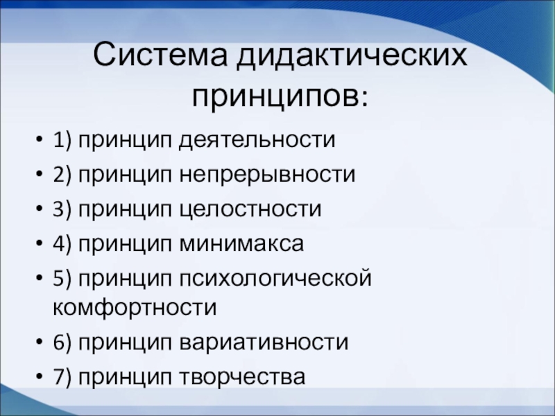 Система дидактических принципов:1) принцип деятельности 2) принцип непрерывности 3) принцип целостности 4) принцип минимакса 5) принцип психологической