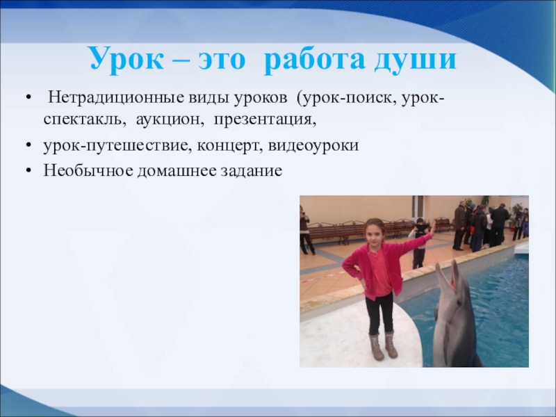 Урок – это работа души Нетрадиционные виды уроков (урок-поиск, урок-спектакль, аукцион, презентация, урок-путешествие, концерт, видеоурокиНеобычное домашнее задание