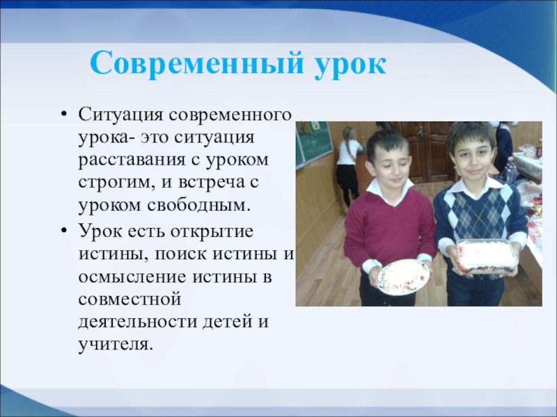 Современный урокСитуация современного урока- это ситуация расставания с уроком строгим, и встреча с уроком свободным. Урок есть