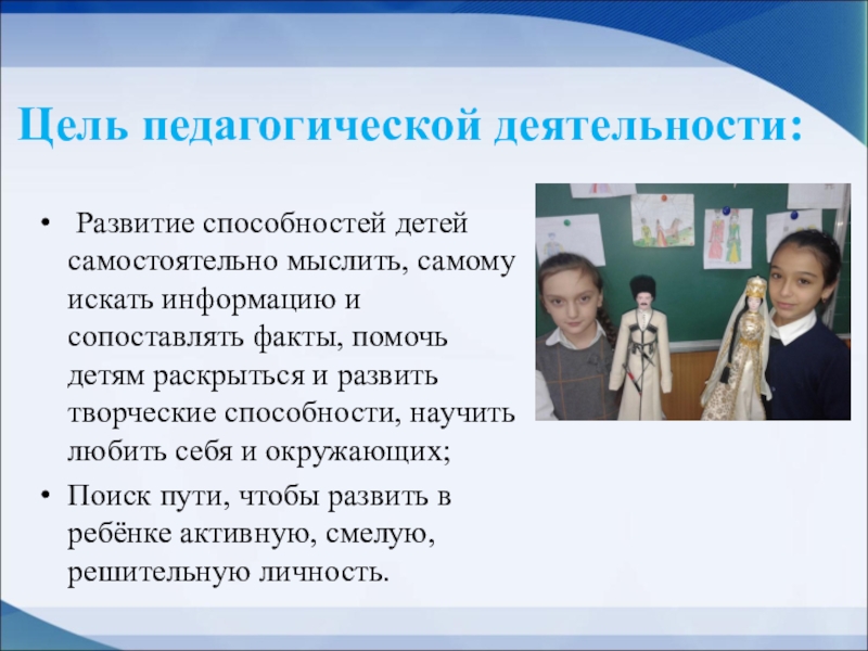 Цель педагогической деятельности: Развитие способностей детей самостоятельно мыслить, самому искать информацию и сопоставлять факты, помочь детям раскрыться
