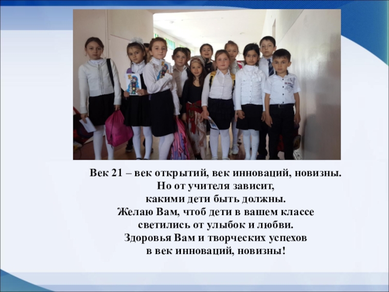 Век 21 – век открытий, век инноваций, новизны.Но от учителя зависит,какими дети быть должны.Желаю Вам, чтоб дети