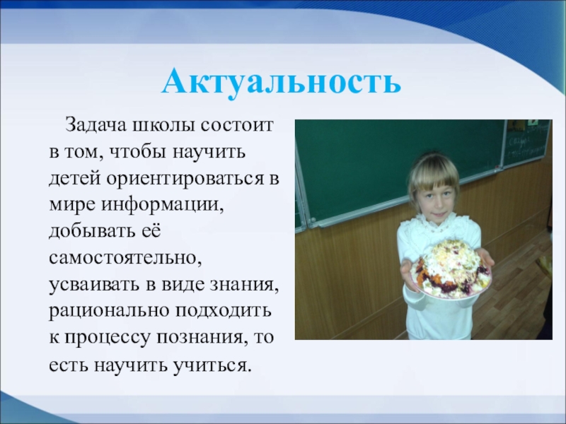 Актуальность    Задача школы состоит в том, чтобы научить детей ориентироваться в мире информации, добывать