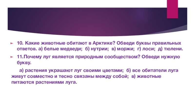 Слайд 1410. Какие животные обитают в Арктике? Обведи буквы правильных ответов. а)