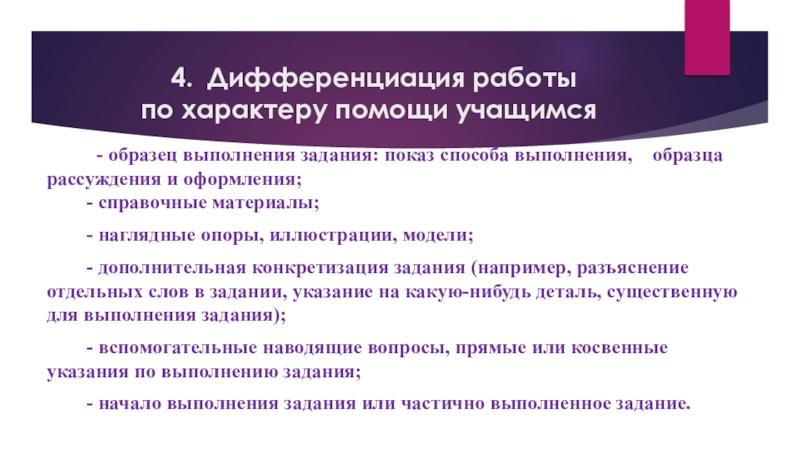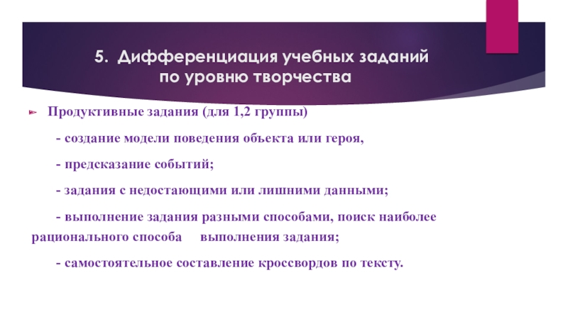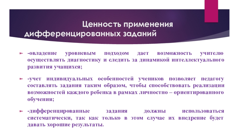 -дифференцированные задания должны использоваться систематически, так как только в этом случае их внедрение будет давать хорошие результаты.