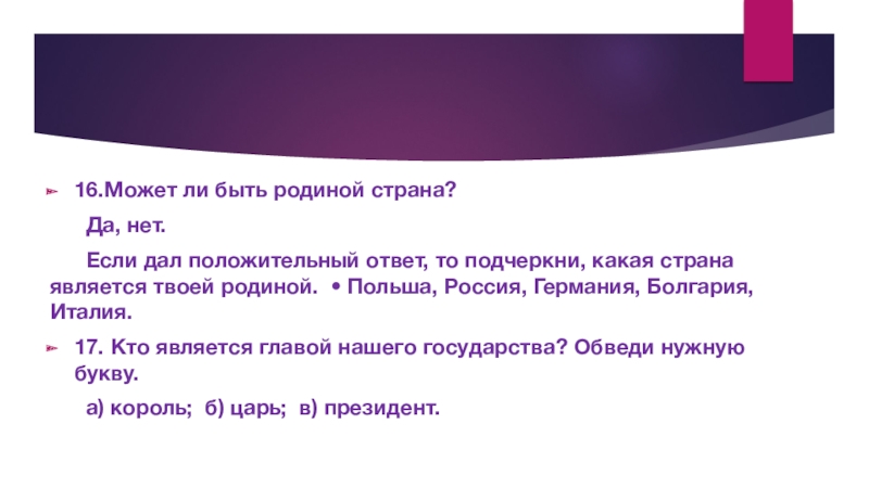 Если дал положительный ответ, то подчеркни, какая страна является твоей родиной. • Польша, Россия, Германия, Болгария, Италия.