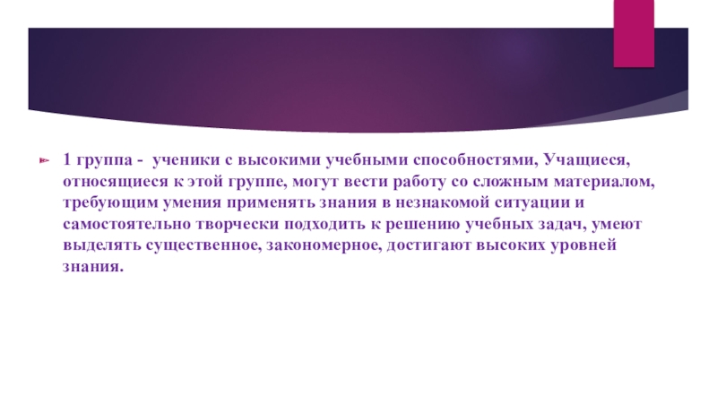этой группе, могут вести работу со сложным материалом, требующим умения применять знания в незнакомой ситуации и самостоятельно творчески подходить к решению учебных задач, умеют выделять существенное, закономерное, достигают высоких уровней знания.