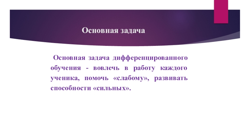 Основная задача дифференцированного обучения - вовлечь в работу каждого ученика, помочь «слабому», развивать способности «сильных».