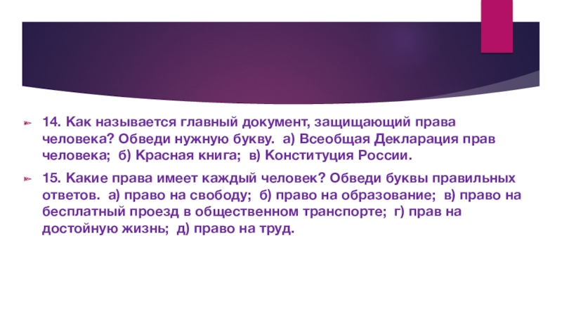 Слайд 1614. Как называется главный документ, защищающий права человека? Обведи нужную букву.