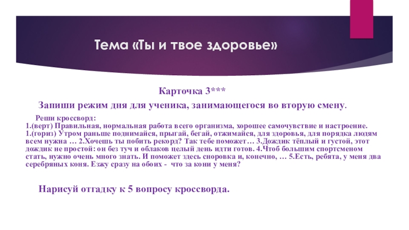 1.(верт) Правильная, нормальная работа всего организма, хорошее самочувствие и настроение. 1.(гориз) Утром раньше поднимайся, прыгай, бегай, отжимайся, для здоровья, для порядка людям всем нужна … 2.Хочешь ты побить рекорд? Так тебе поможет… 3.Дождик тёплый и густой, этот дождик не простой: он без туч и облаков целый день идти готов. 4.Чтоб большим спортсменом стать, нужно очень много знать. И поможет здесь сноровка и, конечно, … 5.Есть, ребята, у меня два серебряных коня. Езжу сразу на обоих - что за кони у меня?