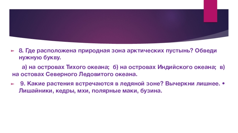 Слайд 138. Где расположена природная зона арктических пустынь? Обведи нужную букву.