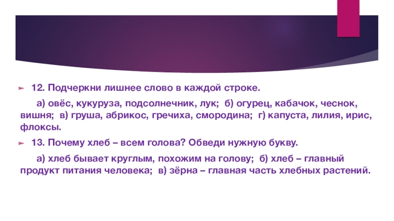 а) хлеб бывает круглым, похожим на голову; б) хлеб – главный продукт питания человека; в) зёрна – главная часть хлебных растений.