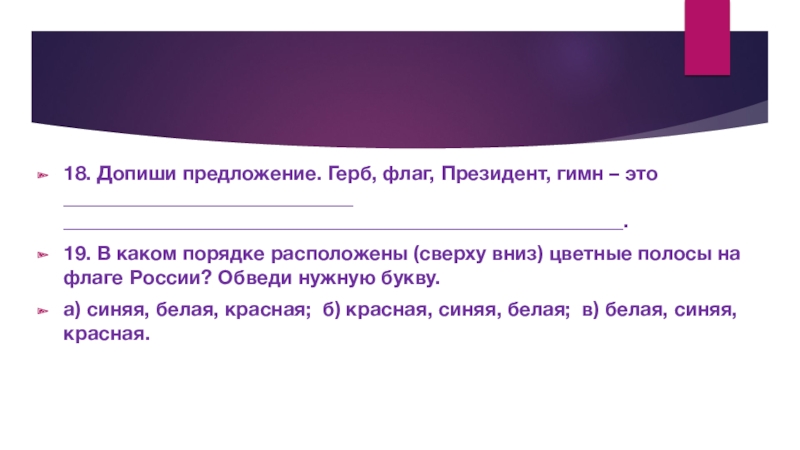 Слайд 1818. Допиши предложение. Герб, флаг, Президент, гимн – это _____________________________ ________________________________________________________.