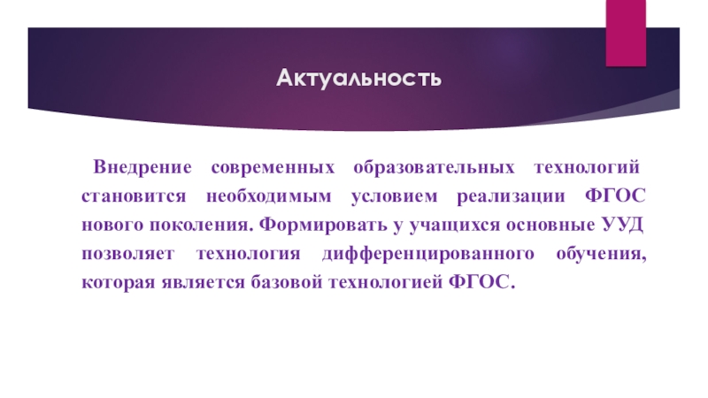 Внедрение современных образовательных технологий становится необходимым условием реализации ФГОС нового поколения. Формировать у учащихся основные УУД позволяет технология дифференцированного обучения, которая является базовой технологией ФГОС.