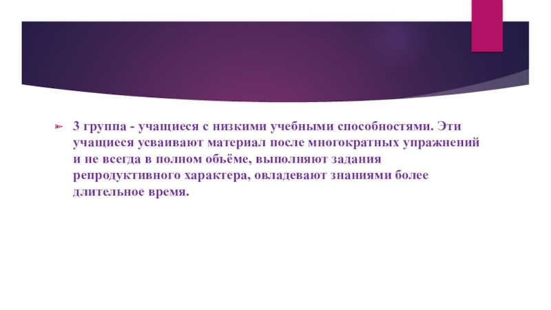 Слайд 233 группа - учащиеся с низкими учебными способностями. Эти учащиеся усваивают