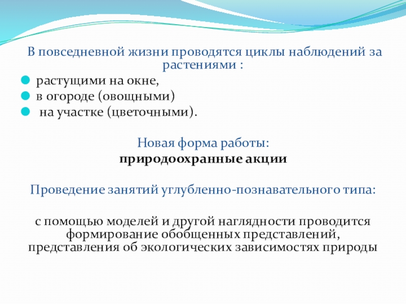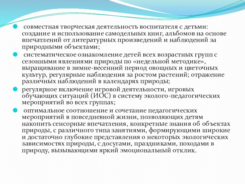 оптимальное соотношение и сочетание педагогических мероприятий в повседневной жизни, позволяющих детям накопить сенсорные впечатления, конкретные знания об объектах природы, с различного типа занятиями, формирующими широкие и достаточно глубокие представления о некоторых экологических зависимостях природы, с досугами, праздниками, походами в природу, вызывающими яркий эмоциональный отклик.