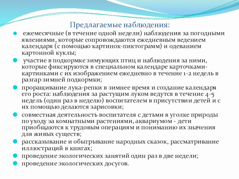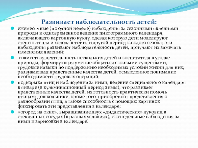 систематическое ознакомление детей всех возрастных групп с сезонными явлениями природы по «недельной методике», выращивание в зимне-весенний период овощных и цветочных культур, регулярные наблюдения за ростом растений; отражение различных наблюдений в календарях природы;