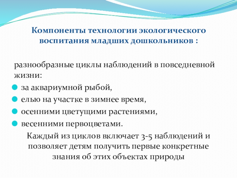 Слайд 6Компоненты технологии экологического воспитания младших дошкольников :