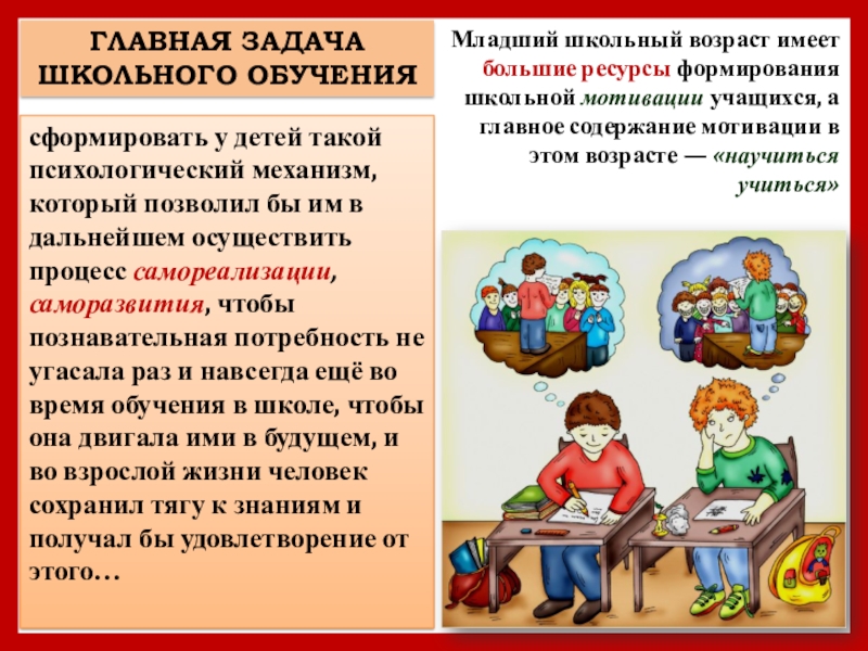 Младший школьный возраст имеет большие ресурсы формирования школьной мотивации учащихся, а главное содержание мотивации в этом возрасте — «научиться учиться»