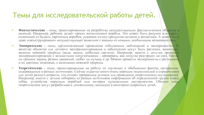 Теоретические - темы, ориентированные на работу по изучению и обобщению фактов, материалов, содержащихся в разных источниках. Сейчас издается много очень хороших энциклопедий и справочников для детей разного возраста, что создает прекрасные условия для проведения теоретических исследований. Например, вместе с детьми собираем из разных источников информацию об определенной группе пород собак, устройстве парусных кораблей или истории музыкальных инструментов. Обычно темы теоретические могут разрабатывать дошкольники, входящие в категорию одаренных детей.