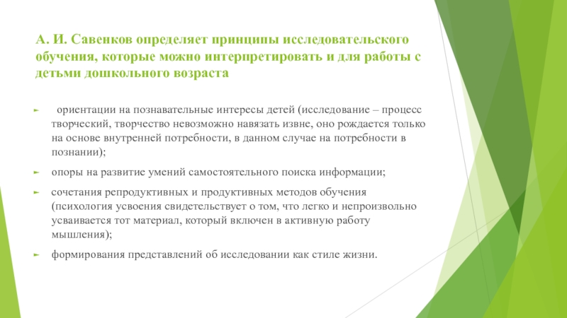 Слайд 8А. И. Савенков определяет принципы исследовательского обучения, которые можно интерпретировать и