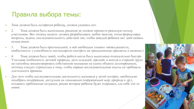 4. Тема должна быть такой, чтобы работа могла быть выполнена относительно быстро. Учитывая особенность детской природы, дети младшей, средней, а иногда и старшей групп не способны концентрировать собственное внимание на одном объекте долговременно, поэтому следует стремиться к тому, чтобы первые исследовательские опыты не требовали длительного времени.