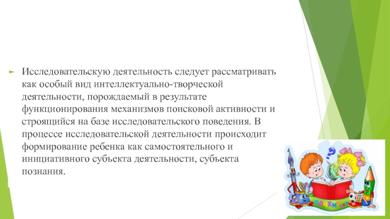 результате функционирования механизмов поисковой активности и строящийся на базе исследовательского поведения. В процессе исследовательской деятельности происходит формирование ребенка как самостоятельного и инициативного субъекта деятельности, субъекта познания.