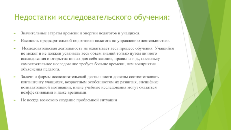 Исследовательская деятельность не охватывает весь процесс обучения. Учащийся не может и не должен усваивать весь объём знаний только путём личного исследования и открытия новых для себя законов, правил и т. д., поскольку самостоятельное исследование требует больше времени, чем восприятие объяснения педагога.