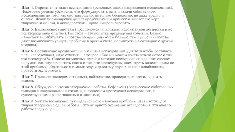 Шаг 9. Указать возможные пути дальнейшего изучения проблемы. Для настоящего творца завершение одной работы – это не просто окончание исследования, это начало работы следующей.