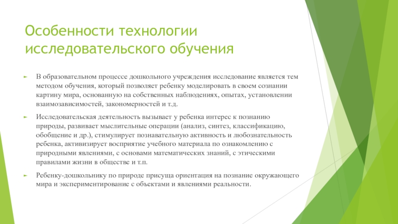 Исследовательская деятельность вызывает у ребенка интерес к познанию природы, развивает мыслительные операции (анализ, синтез, классификацию, обобщение и др.), стимулирует познавательную активность и любознательность ребенка, активизирует восприятие учебного материала по ознакомлению с природными явлениями, с основами математических знаний, с этическими правилами жизни в обществе и т.п.