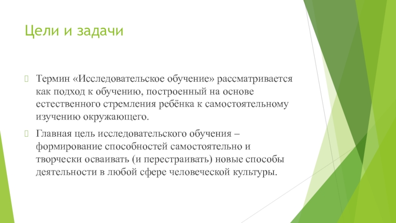 Главная цель исследовательского обучения – формирование способностей самостоятельно и творчески осваивать (и перестраивать) новые способы деятельности в любой сфере человеческой культуры.