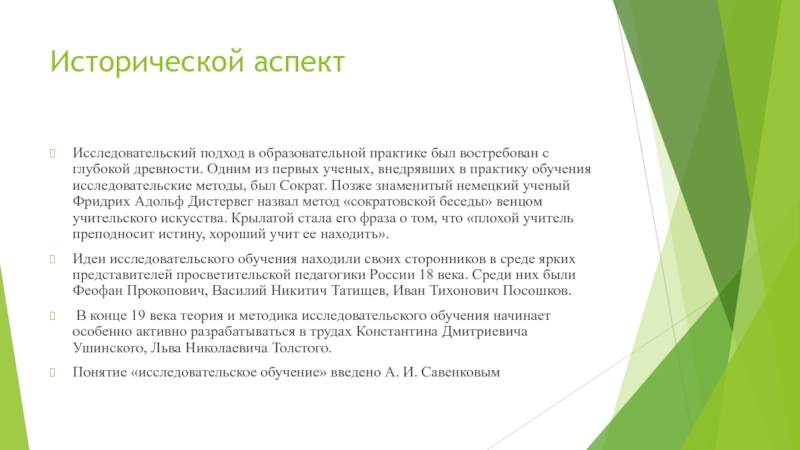 Идеи исследовательского обучения находили своих сторонников в среде ярких представителей просветительской педагогики России 18 века. Среди них были Феофан Прокопович, Василий Никитич Татищев, Иван Тихонович Посошков.