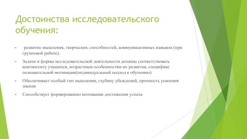 Задачи и формы исследовательской деятельности должны соответствовать контингенту учащихся, возрастным особенностям их развития, специфике познавательной мотивации(индивидуальный подход к обучению)