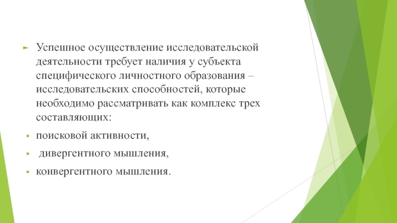 Слайд 6Успешное осуществление исследовательской деятельности требует наличия у субъекта специфического личностного образования