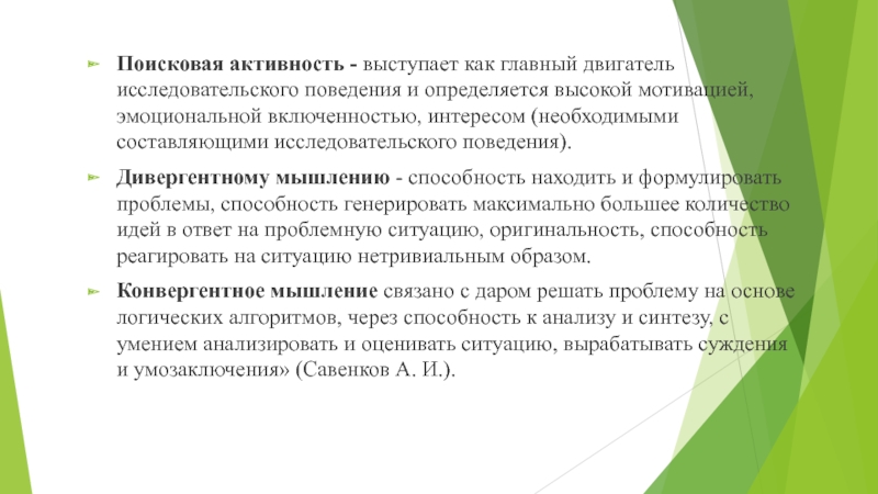 Слайд 7Поисковая активность - выступает как главный двигатель исследовательского поведения и определяется