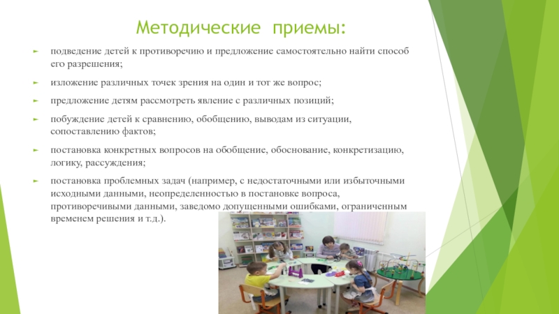 побуждение детей выдвигать гипотезы, делать предварительные выводы и обобщения (противоречие – ядро проблемной ситуации – в данном случае возникает в результате столкновения различных мнений, выдвинутого предположения и результатов его опытной проверки в процессе диалога.